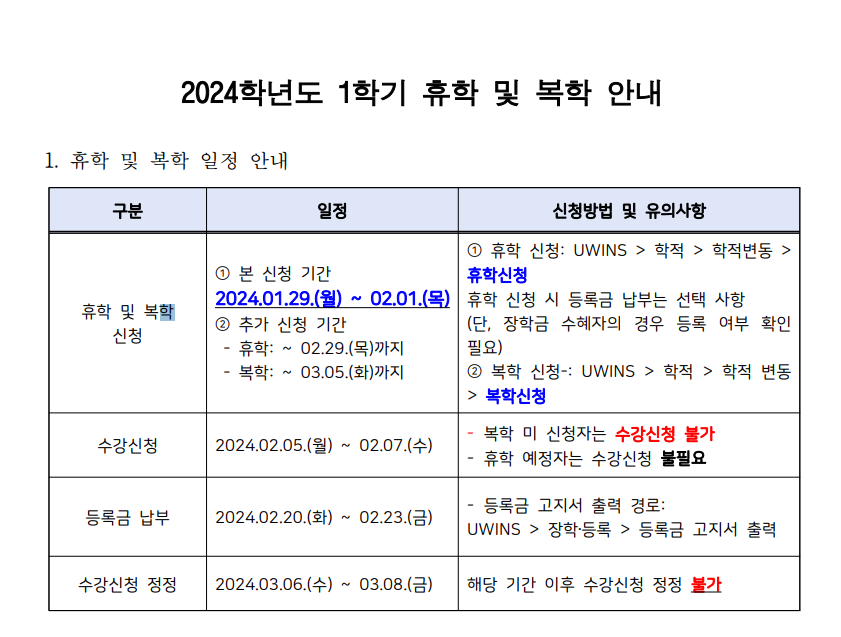 2024학년도 1학기 휴학 및 복학 안내입니다. 휴학 및 복학을 하는 학생은 신청 기간 내에 신청하셔야 합니다. 휴학 및 복학 일정: 2024. 1. 29.(월) ~ 2. 1.(목) (※ 단, 휴학은 등록금 전액 이월 기준 2. 29.(목)까지, 복학은 수강정정 기한 기준 3. 5.(일)까지 추가 신청 가능함)